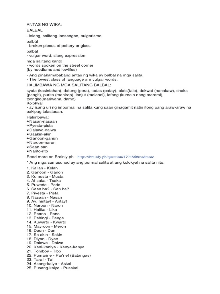 Pabalbal Balbal May katumbas itong slang sa Ingles at itinuturing na pinakamababang antas ng wika. By Cielo Fernando July 16 2021. Gayunman dahil ang ilang pangkat etniko o mga katutubo sa bansa ay mayroong kaugnayan ang salitang salita na napapaloob sa kanilang wika ay mayroong pagkakatulad lalo na kung nasa iisang rehiyon lalawigan o bayan ang mga ito.