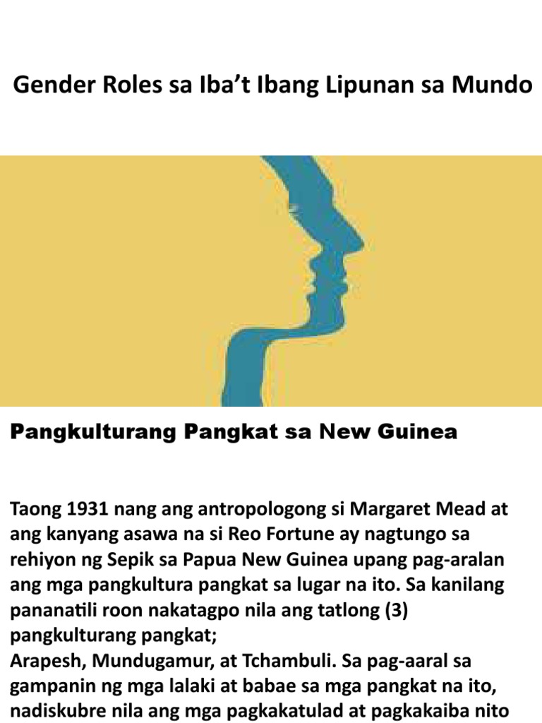 Primitibong pangkat gampanin lalaki babae arapesh mundugumor sanggunian a mead from cas 133 at don mariano marcos memorial state university gender roles ng pangkat etniko sa pilipinas ding sa bahaging ito ay kritikal mong masusuri ang mga konseptong iyong napagaralan na may kinalaman sa kasarian at gender roles sa lipunan ng pilipinas.